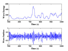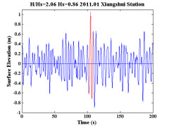 图1.3.2 响水站实测畸形波波形(左)、畸形波峰度与H/Hs的比值(中)、畸形波SIWEH谱与波面过程的比较(右)