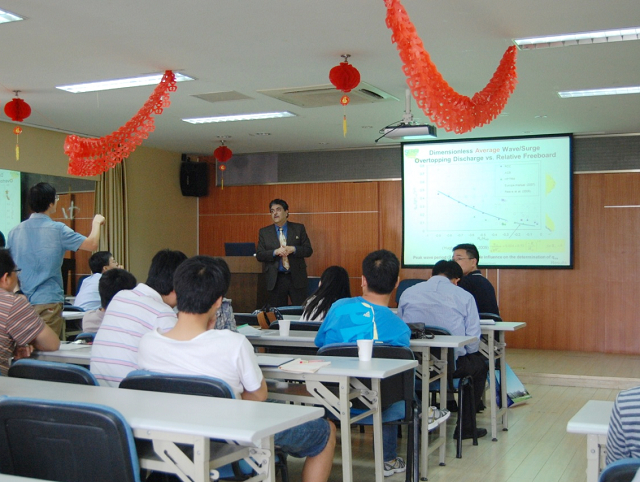 6月5日,杰克逊州立大学土木与环境工程系主任Farshad Amini教授应邀来到欧洲足球赛程 ,在严恺馆702就海堤溢流溃堤、海堤坡面防护等方面的研究为港航院师生做了一场学术报告。本次报告主要介绍了三种海堤背水坡的保护系统(碾压混凝土 Roller Compaction Concrete、铰接式护坡砖 Articulated Concrete Blocks、高性能加筋草皮 High Performance Turf Reinforcement Mat)溢流和波浪溢流的大型物理试验的研究成果。该试验是在美国俄勒冈州立大学的波浪研究实验室内进行的原物尺寸的水槽实验,消除了前人使用小尺度海堤引起的尺度效应。通过试验,对每一种海堤保护系统上发生溢流和波浪溢流时的详细水力学数据(包括流量、流速、水深、波浪特征等)给出了预测方法,对海堤保护系统表面的侵蚀特征做出了总结;并对三种海堤保护系统的水力学表现进行比较,给出了三种海堤保护系统的保护作用的评估。