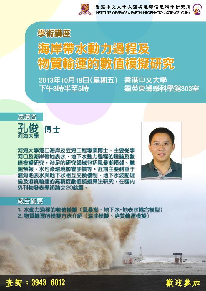 2013年10月18日,欧洲足球赛程 孔俊副教授应香港中文大学太空与地球信息科学研究所邀请,在香港中文大学开展学术讲座《海岸带水动力过程及物质输运的数值模拟研究》。孔俊副教授长期从事河口及海岸带地表水、地下水动力过程的理论及数值模拟研究,涉足的研究领域包括风暴潮预报、咸潮预报、水污染环境影响评价等,近年来侧重于滨海地表水与地下水相互交换机制、地下水波动理论及水体中污染物输运的高精度数值算法研究,在国内外刊物发表学术论文20余篇。本次讲座,孔俊副教授对其近年来提出的高精度物质输运模拟算法“A High-resolution method for the depth-integrated solute transport equation based on an unstructured mesh”和地表水—地下水整体模型“A new model for coupling surface and subsurface water flows: With an application to a lagoon” 进行了宣讲,并与中大科研人员就下阶段的合作进行了深入交流。