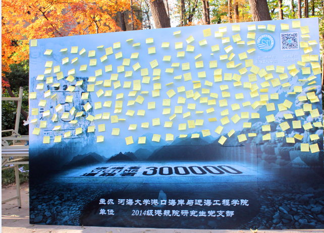 本次悼念活动由港航院2014级研究生党支部主办,活动内容是向过往的学生和路人分发我们自己设计的公祭日宣传册,引导他们在心愿便利贴上写下自己的话语,并张贴在我们精心设计的祈愿墙上,以此表达我们对在南京大屠杀中遇难同胞的深切哀思和沉痛悼念。