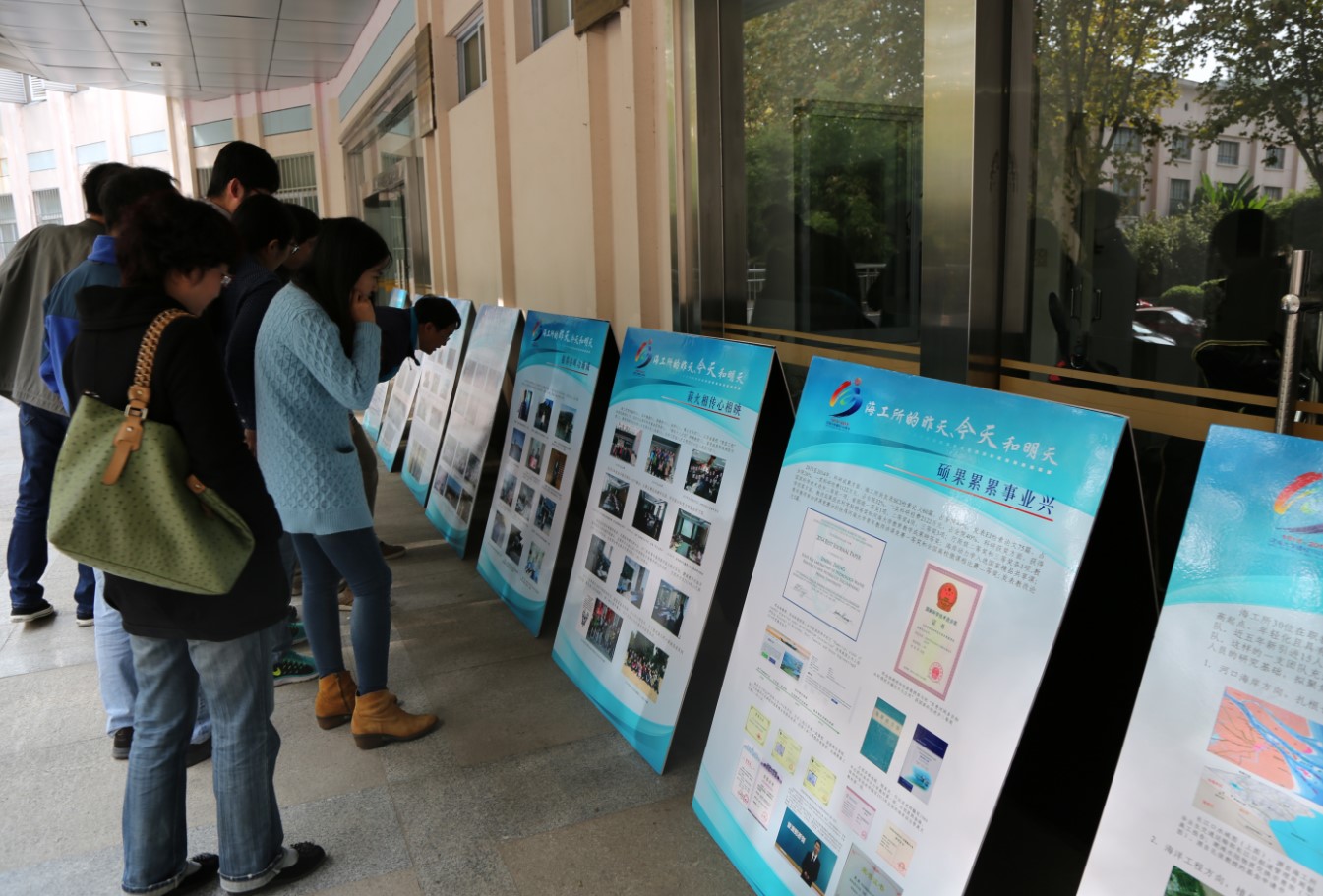 该展览由“前言”、“昨天”“今天”、“明天”和“后记”五个板块组成。“前言”中详细记述了海工所自1979年由水利部批准组建发展至今的历史沿革,明确了校庆期间组织本次文化展的定位和意义。“昨天”板块由“海洋攻关自请命”、“心无旁骛力践行”、“春风化雨潜滋润”和“报得春晖功渐成”四个展板组成,展示了海工所历史发展过程中,特别是海工所发展初期老一辈海工人在为我国海岸及海洋工程事业发展及人才培养等方面表现出的努力拼搏的精神、勇于担当的气魄和高瞻远瞩的智慧。“今天”板块由“薪火相传心相映”和“硕果累累事业兴”两个展板组成,展示了海工所近五年在人才培养、科学研究、服务社会已经团队建设等方面的主要成绩,也展示了海工所全体同仁团结友爱的融洽气氛、乐观向上的积极心态和井然有序的前进势态。“明天”板块由“新人应有新气象”和“大哉海工奔前程”两个展板组成,展示了海工所未来重点发展的学科方向已经发展愿景,展现了现代海工人继往开来的决心和稳步前进的信心。“后记”板块再次强调了本展览在回顾历史、总结现在和展望未来中的作用,并对包括提供历史资讯的老一辈海工人等所有为本次展览活动付出辛苦努力的人和组织表达了最真诚的谢意。