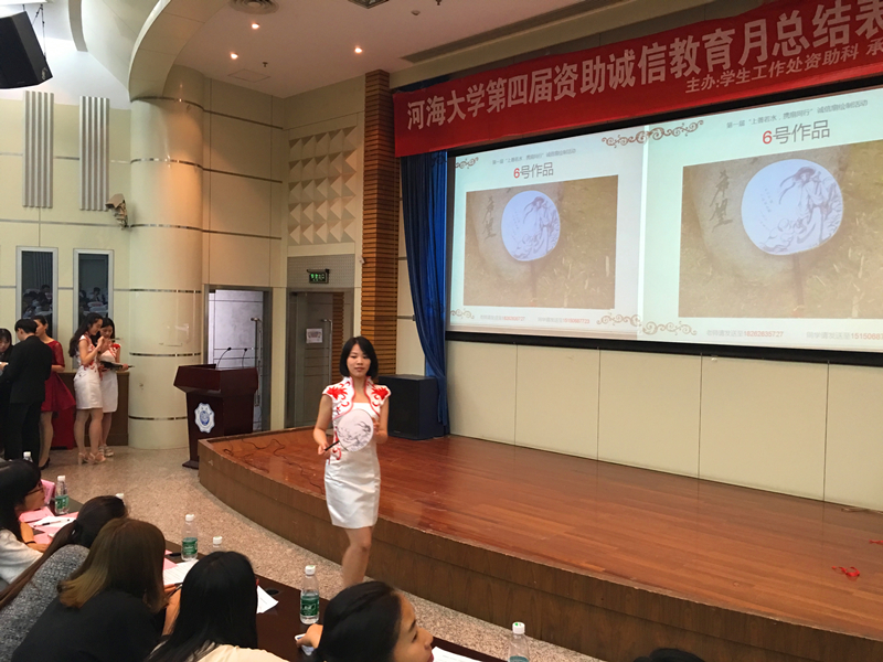 活动分为现场创作和各学院征集展示两部分。在5月18日的现场征集活动中,场地挤满了报名参赛和现场创作的同学,他们用自己手中的笔表达出自己对于诚信的理解,风格各异。现场创作共收到作品二十余件,每一件都是作者心中对于诚信的独特理解,一份诚信宣言。之后,各学院积极选送优秀作品参加比赛,作品在6月7日的表彰大会上,由礼仪同学着古典礼仪服动态展示,得到了在场所有老师和同学的啧啧称赞,也吸引了大家热情地参与投票。最后挑选出来的24件作品,或气势重如山岳,或精致巧夺天工,每一件作品都给观众们留下了深刻的印象。
