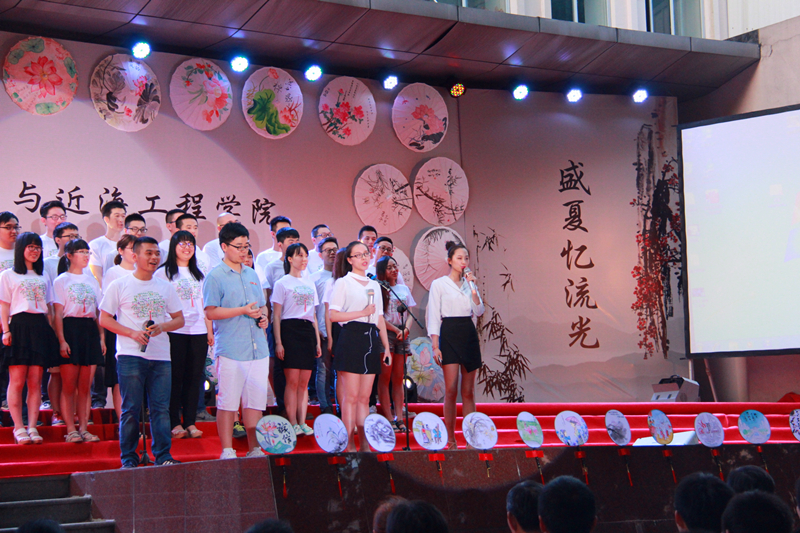 晚会会场整体风格为传统水墨风,以廉洁主题手绘花伞、诚信主题手绘面扇装饰,主题墙以传统文化中“四君子“为背景,蕴含着学院对毕业生的希冀和祝愿。整场晚会由学院2016届毕业生自编、自导、自演,现场气氛温馨融洽、高潮迭起。晚会在研究生一段活力四射的啦啦操《青春派对》中拉开帷幕,合唱《南山南(河海版)》、话剧《五十年后》、相声《我的大学生活》、诗朗诵《如果在河海拥有爱情》等等形式多样、内容丰富的节目,无不表达了毕业生对大学生活的留念之情和对母校的深深祝福。晚会期间,郑金海院长亲自为毕业生献上祝福,邵宇阳、张弛、周晶晶三位班主任参与表演,为同学们的大学生活画上圆满的句号。