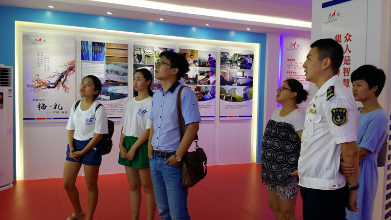 7月13日上午九点,在南京海事局团委书记刘育莎的带领下,在两位指导老师港航院团委书记朱钰、港航院14级辅导员季超的陪同下,实践团队驱车来到位于长江边的梅山海事处,经刘书记介绍后,为前来办理业务的船员派发问卷。在船员办理好业务后,团队成员引导船员填写问卷,并主动询问船员对江豚的看法。十一点时,实践团队结束问卷调查活动,在刘书记的带领下,参观梅山海事处工作展厅。过程中,队员结合的江豚生存环境,针对船舶溢油提出问题,工作人员一一耐心地给予解答。