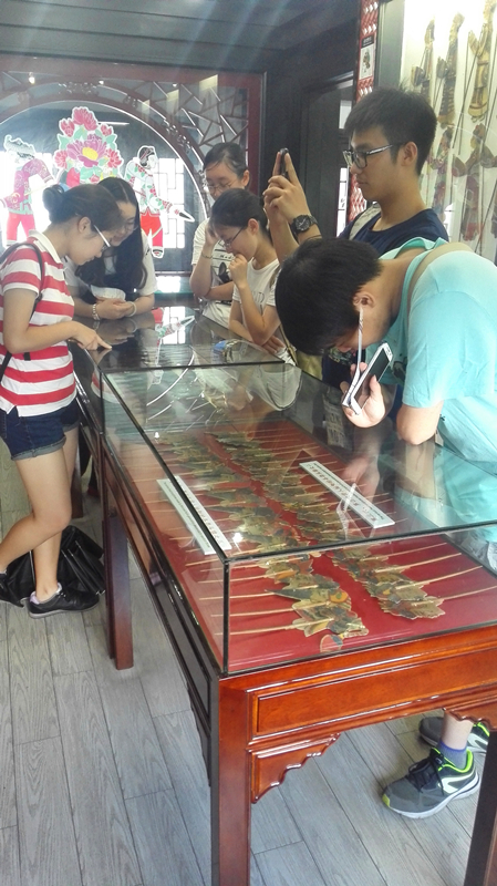 7月12日,队员们参观了位于七宝古镇北大街的皮影馆,了解皮影艺术的传承发展。它作为一项市级非物质文化遗产,是上海非遗的代表之一,得到了地方政府的重视与支持。场馆集展览、制作、演出、研究与收藏为一体,为文化的保存与发展提供了有利条件。在此,队员们可以了解到皮影戏表演者的介绍、了解地方皮影戏的历史与特色、看到每代大师所制作的皮影戏道具等。通过参观历代皮影演艺的设备可以看出这种艺术形式虽然简陋却能混合本土方言和京昆戏腔,融会贯通多种艺术形式成为百姓喜闻乐见的精神食粮,推动了上海地区皮影戏的兴盛。在展馆定期进行的皮影戏演出中,原汁原味的方言更增添了传统文化的气息,吸引众人观看并有助于传播这项非物质文化遗产。