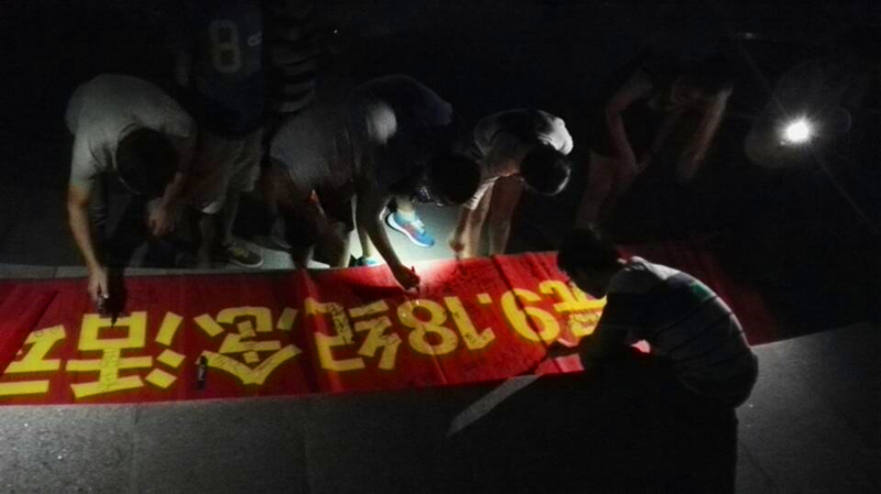 同学们在小浪底广场将蜡烛摆成“9.18”的字样,陈亚楠同学致开场辞: “当我们一次又一次回顾这段历史,我们忆起的是国耻,是屈辱,但9.18给我们带来的更有奋发图强的前进动力!”随后,大家进入默哀环节。所有人低下头,右手附于心口处,在心中为那些在九一八事变中牺牲的先烈沉痛哀悼。夜晚的风有些喧闹,柔和的烛光在风中明亮地闪烁,似乎照亮了曾经笼罩在黑暗中的一切,哔剥响起来,渐渐昏暗下去,化作一缕青烟,载着思绪,消散在空中……蜡烛一个接一个地熄灭了,大家在横幅上签字以示悼念。最后科协成员向参加活动的同学们发放纪念勋章,纪念活动圆满结束。