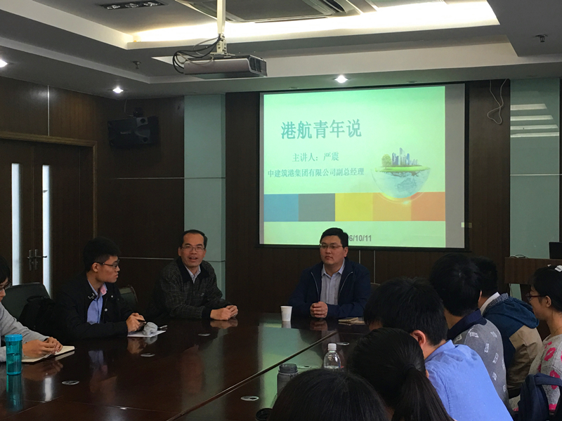 2016年10月11日下午四点,学院邀请到了港航杰出校友、中建筑港集团有限公司副总经理严震做客《港航青年说》,与同学们进行了面对面的交流,郑金海院长和13级本科生辅导员王玲老师也出席了本次座谈会。本次座谈会在严恺馆502举办,座无虚席,大家交流出奇的热烈。严总结合自身工作经历讲述专业发展和职业规划,分享工作经验和人生感悟,同时解惑答疑,为同学们提供就业和发展指导。