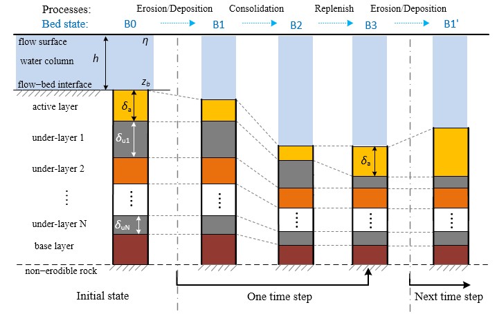 周曾副研究员与荷兰Deltares水利科学研究院以及新西兰Auckland大学的学者们合作,基于Gibson固结理论研发了淤泥质河口海岸的底床固结模型,并嵌套进业内知名开源水流-泥沙-地貌耦合软件Delft3D中。淤泥质海岸在世界范围内广泛分布,其泥沙特性与沙质海岸截然不同,最典型的是其高含水率、絮凝等特性。在当前二维或三维地貌演变的数学模型中,对于淤泥的固结效应的中长期影响还很有限,而固结可以很大程度上影响床面高层以及泥沙抗剪强度,本研究揭示了潮滩演变在考虑或忽略固结效应下的极大不同,在实际工程中(例如吹填工程和退陆还海工程)有着不可忽视的重要性。