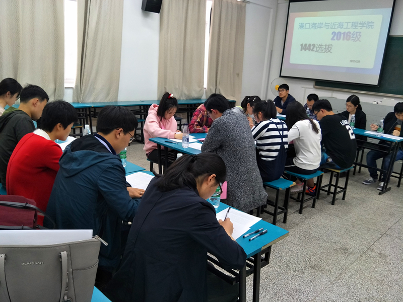 2017年4月20日,在致高楼A215教室,港航院“1442工程”学员面试工作选拔顺利举行,参与本次面试的有学院2016级班导师徐鹏飞、王华坤、徐振山、王韫玮,各年级辅导员以及学生代表。