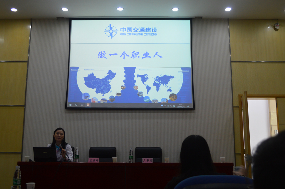 虞康玮经理在中交四航局人力资源部工作多年,拥有招聘和培训公司员工的丰富经验。她以“做一个职业人”为主题,从个人经历和工作体会谈起,从企业的角度,谈个人职业生涯规划和公司发展的联系和区别,希望即将走上工作岗位的毕业生,目光长远,做一个潜心努力、踏实工作的新员工。她强调,要一直保持学习的耐心和热情,这样才能在工作中不断充实自己,提高自己的竞争力。
