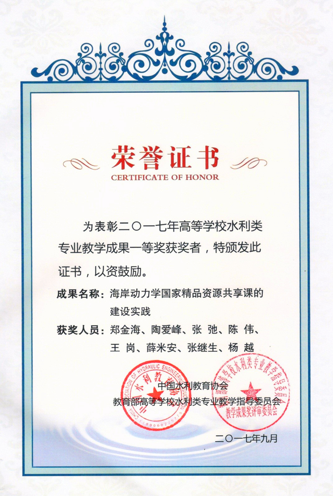 欧洲足球赛程 郑金海、陶爱峰、张弛、陈伟、王岗、薛米安、张继生和杨越老师联合申报的教学成果“海岸动力学国家精品资源共享课的建设实践”获2017年度高等学校水利类专业教学成果奖一等奖。