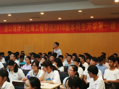 开学典礼后,龚政院长给港航院2018级全体新生讲授开学第一课。龚院长从学校悠久的历史讲述到学院光辉的历程,结合时代背景和国家战略,谈港航专业的内涵和发展,他用“舟楫之便,向海而兴”八个字强调了港航专业的意义与优势所在,他指出,无论国内还是国外,在很多重点水利工程的设计和建设中都能看到港航人的身影,同学们应以此为傲,也应为此而奋斗努力。同时,龚院长从新生的视角,深入浅出地引导新生结合专业尽早确立目标、规划大学生活,书写自己无悔的青春。新生对开学第一课兴趣浓厚,现场提出很多问题,龚院长一一答疑解惑。