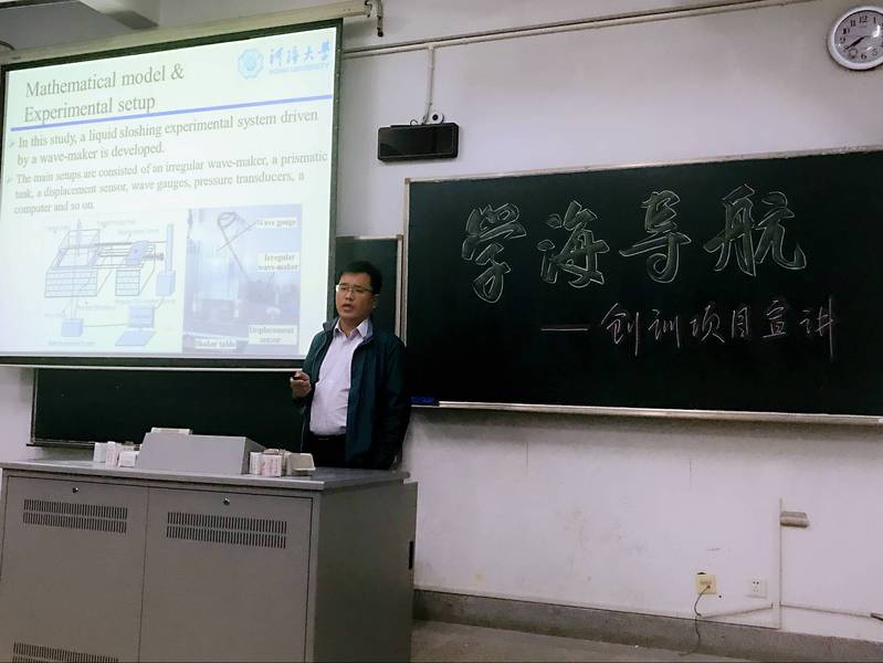 薛米安老师重点讲解了有关波浪波形对容器壁作用的项目。薛老师用非常细致的讲述为同学们介绍了这个项目的背景应用、实验方法与预测成果,台下的同学们认真地听着介绍,时而思索、时而记录。