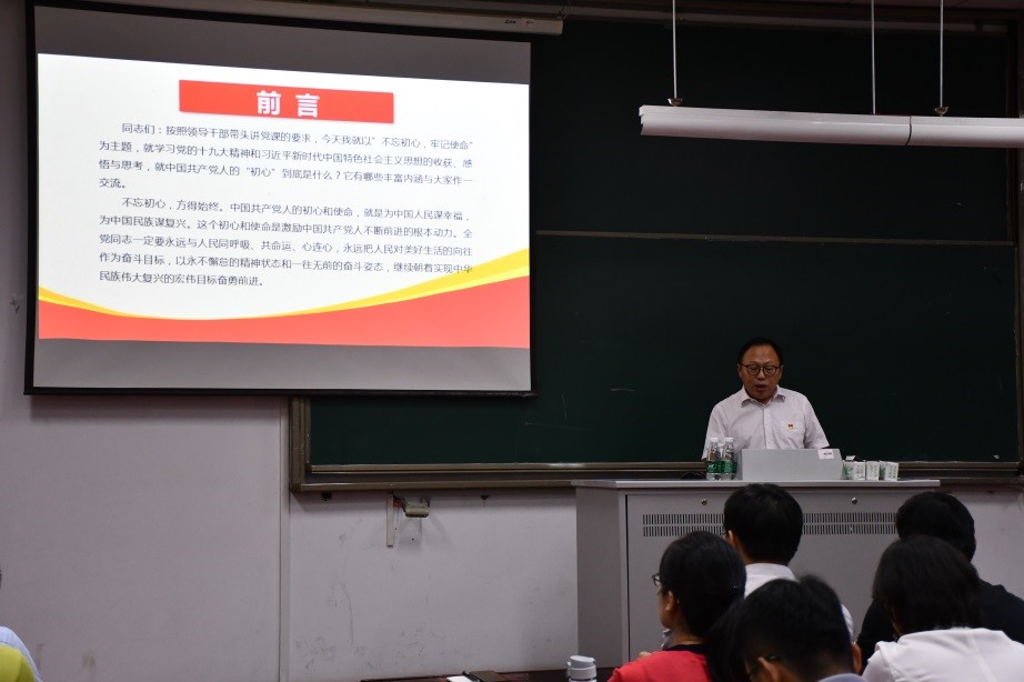 9月19日,为切实增强“不忘初心、牢记使命”主题教育集中学习研讨的针对性、实效性和感染力,学院党委在水利馆201举行“不忘初心、牢记使命”主题教育辅导报告会,学院党委胡忠华作辅导报告。全体中层干部及全体师生党员参加报告会。