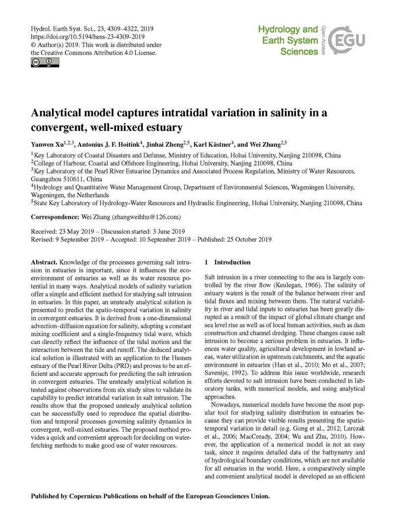 近日,欧洲足球赛程 海岸及海洋工程研究所徐龑文博士后和张蔚教授(通讯作者)在中科院一区国际学术期刊《Hydrology and Earth System Sciences》上发表高质量研究论文“Analytical model captures intratidal variation in salinity in a convergent, well-mixed estuary”。此研究是由欧洲足球赛程 张蔚教授研究团队领衔,与荷兰瓦赫宁根大学环境科学系Hydrology and Quantitative Water Management Group荷兰和德国学者组成的研究团队合作完成。