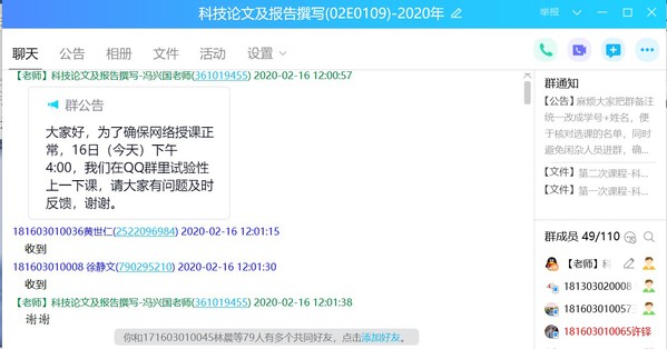 信息技术与现代教育的深度融合是教与学的改革创新。充分利用线上即时教学优势,港航师生实现了五湖四海同时连线,因疫情相隔千里的远程教学,在线上课堂上又热闹了起来。主讲《基础工程》的庄宁老师和黄挺老师在线上直播平台实现了配合默契的“一同”授课;主讲《科技论文与研究报告撰写》的冯兴国老师通过QQ直播带领着来自港航院、水电院、农工院等多个学院以及与南京水利科学研究院联合培养的共90余名研究生学习撰写科技论文与凝练科研题目的技能;主讲《水下机器人》的徐鹏飞老师借助腾讯会议软件让每个学生都参与线上讨论等互动环节,及时掌握教学效果;主讲《工程商务》的雷智鹢老师利用线上优势,采用了分片教学的模式进行单独授课、单独讨论和单独答疑。线上课堂形式多样,以即时影音、图文等方式对学生进行全方位的引导与解惑,不仅活跃课堂氛围,还可调动学生的学习积极性。