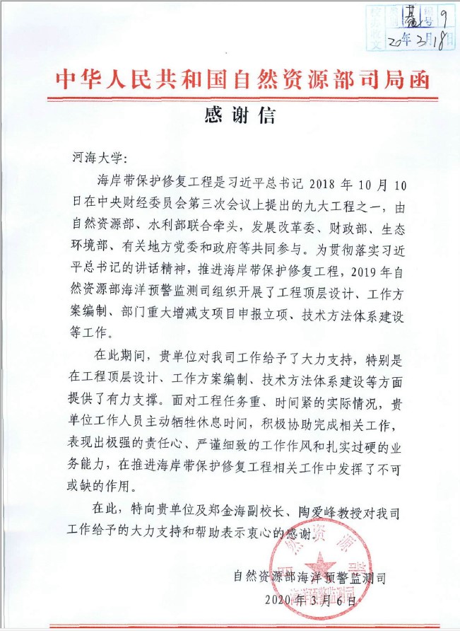 感谢函中提及:海岸带保护修复工程是习近平总书记2018年10月10日在中央财经委第三次会议上提出的九大工程之一,由自然资源部、水利部联合牵头,发展改革委、财政部、生态环境部、有关地方党委和政府等共同参与。为贯彻落实习近平总书记的讲话精神,推进海岸带保护修复工程,2019年自然资源部海洋预警监测司组织开展了工程顶层设计、工作方案编制、部门重大增减支项目申报立项、技术方法体系建设等工作。在此期间,欧洲足球赛程 郑金海教授和陶爱峰教授对该工作给与了大力支持,特别是在工程顶层设计、工作方案编制、技术方法体系建设等方面提供了有力支撑。面对工程任务重、时间紧的实际情况,他们主动牺牲休息时间,积极协助完成相关工作,表现出极强的责任心、严谨细致的工作作风和扎实过硬的业务能力,在推进海岸带保护修复工程相关工作中发挥了不可或缺的作用。
