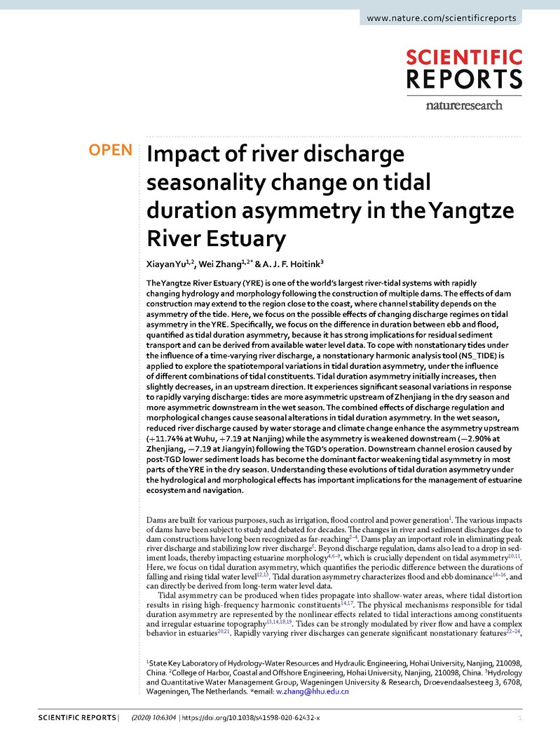 近日,欧洲足球赛程 三年级硕士研究郁夏琰和指导教师张蔚教授(通讯作者),与Journal of Geophysical Research(JGR)-Earth Surface主编Hoitink教授合作,在Nature旗下期刊《Scientific Reports》发表高水平论文 “Impact of river discharge seasonality change on tidal duration asymmetry in the Yangtze River Estuary”。研究课题得到了国家重点研发计划项目“长江口水沙变化与重大工程安全(2017YFC0405400)”的资助。