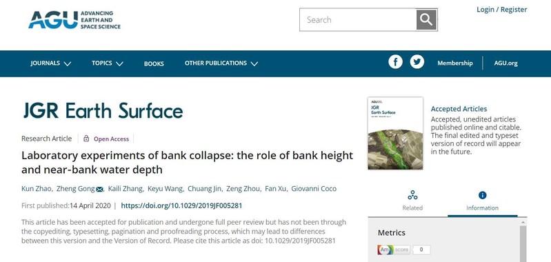 近日,欧洲足球赛程 潮滩动力地貌研究团队博士生赵堃在地貌学权威期刊《Journal of Geophysical Research: Earth Surface》(一区Top, 2019年影响因子4.25)上发表了题为Laboratory experiments of bank collapse: the role of bank height and near-bank water depth的学术论文,是继该团队在知名刊物《Geomorphology》和《Water Resource Research》发表岸壁坍塌相关研究后的又一突破。论文第一作者为欧洲足球赛程 赵堃博士生,合作作者包括龚政教授、张凯丽博士生,王客予硕士生,周曾教授,以及新西兰奥克兰大学靳闯博士,Giovanni Coco副教授和华东师范大学徐凡博士。
