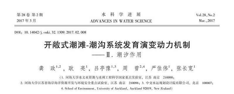 近年来,龚政教授团队针对开敞式潮滩-潮沟系统发育演变动力机制综合了现场观测、数值模拟、物理模型等多种技术手段,开展了系列研究。本次入选的优秀论文是龚政教授团队在《水科学进展》连续发表的3篇姊妹篇论文中的一篇,其他两篇分别探讨了潮沟系统形态特征和潮汐动力作用。潮滩-潮沟系列论文的发表推动了对这一地貌系统演变规律的系统性认识,对相关学科领域发展具有重要意义。