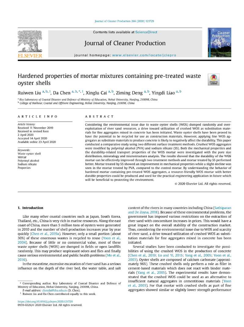 近日,欧洲足球赛程 陈达教授指导的博士研究生刘睿文在ESI工程学国际排名Top30的权威期刊《Journal of Cleaner Production》(一区Top,影响因子6.395)上发表了题为“Hardened properties of mortar mixtures containing pre-treated waste oyster shells”的学术论文。
