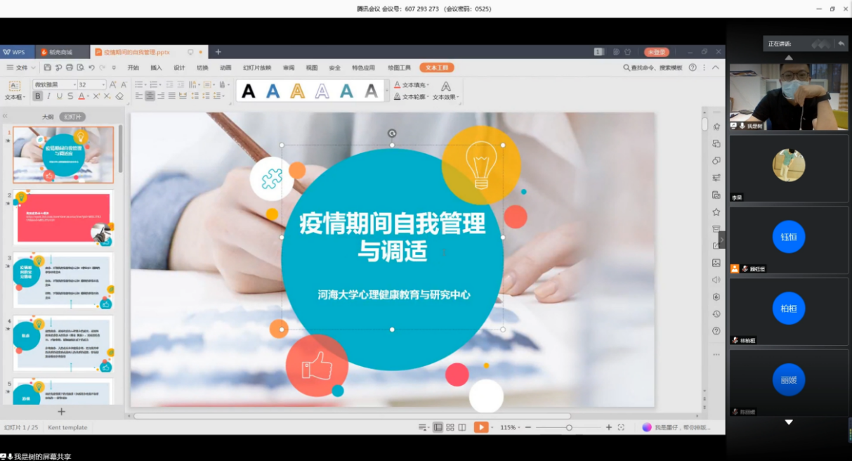 2020525日晚7点,港航院邀请了校心理健康中心赵东伟老师为全体学生做了“疫情期间自我管理与调适”心理讲座。