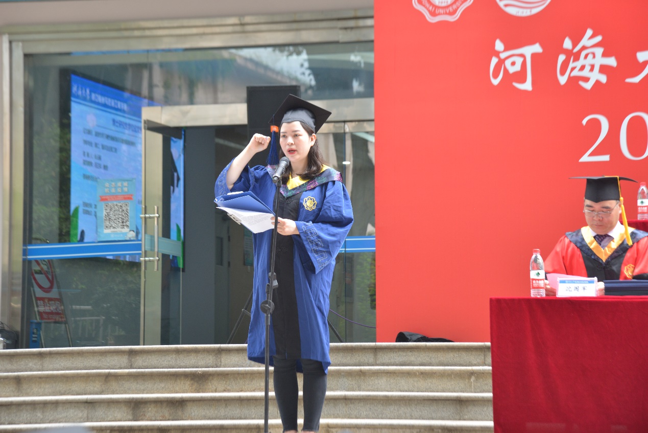 2017级硕士生施逸辰同学作为毕业生代表发言,表达对老师们的感激之情和对母校的依依惜别之情,表达立鸿鹄志,做奋斗者,不负青春,不负年华的志向。施逸辰同学带领毕业生庄严宣誓,立誓做一个合格的港航人。