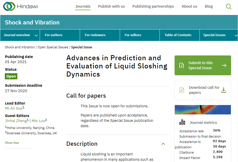 5.1投稿时请选择Special Issue: Advances in Prediction and Evaluation of Liquid Sloshing Dynamics