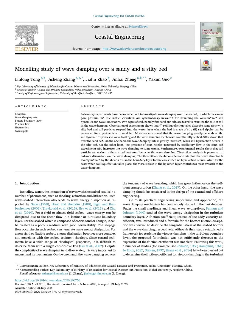 近日,欧洲足球赛程 童林龙博士后与合作导师郑金海教授、张继生教授在海岸工程类顶级期刊《Coastal Engineering》(欧洲足球赛程 A类期刊,中信所1区,影响因子4.119)上发表题为:“Modelling study of wave damping over a sandy and a silty bed”的研究论文。