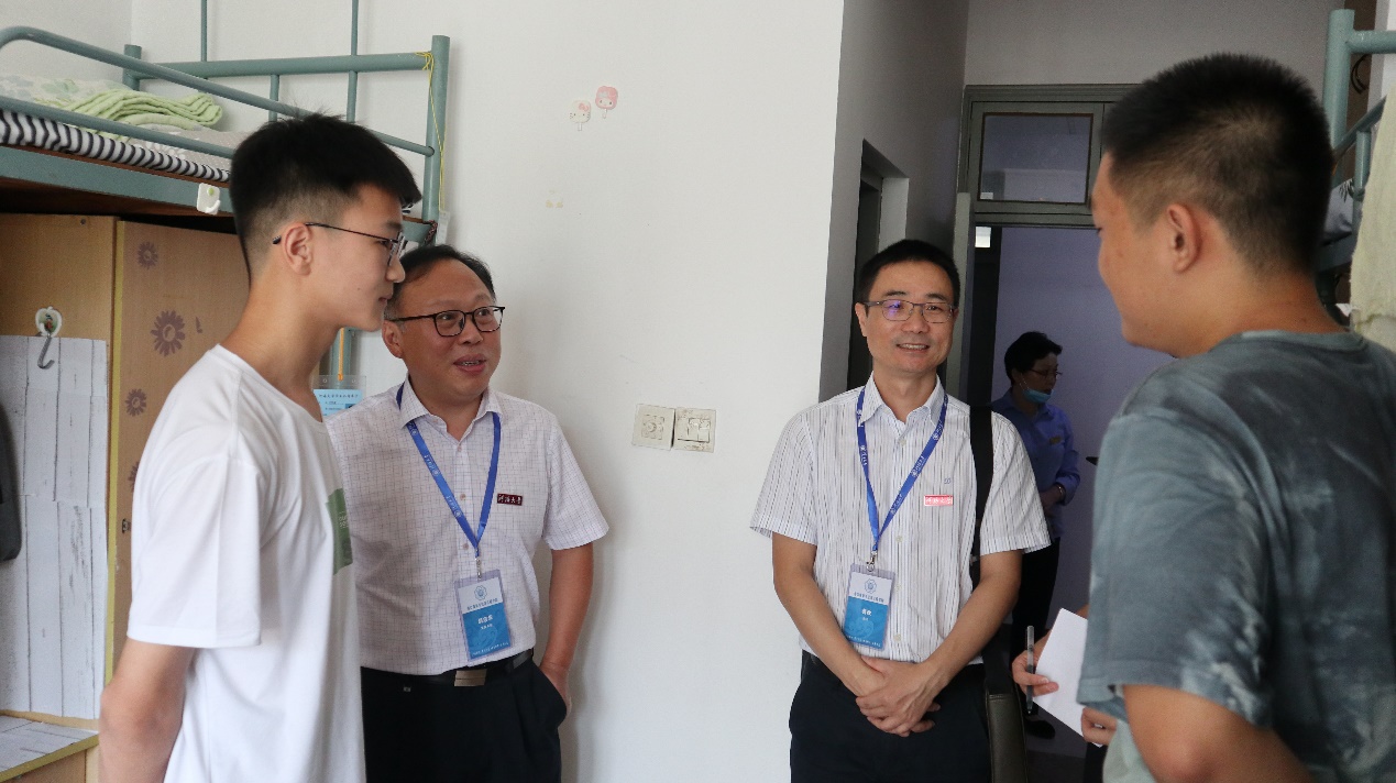 2020年9月8日,港航学院龚政院长、胡忠华书记、沈国军副书记在辅导员顾钰恒老师、林晨老师的陪同下,走访江宁校区教学区六舍和八舍,亲切地慰问了2020级新生。