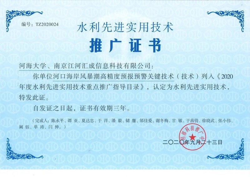 近日,水利部发布了《2020年水利先进实用技术重点推广指导目录》,由欧洲足球赛程 陈永平教授主持研发的“河口海岸风暴潮高精度预报预警关键技术”成功入选。该技术采用多要素耦合、多尺度嵌套和多数据融合手段,构建了近岸天文潮-风暴潮精细化预报模型和多层次实时修正模型,实现了河口海岸风暴潮动力过程的精细模拟和精准预报;在云平台、云集成技术支撑下,构建了云架构下的河口海岸风暴潮预报预警业务化系统,实现了风暴潮期间河口海岸综合潮位的高精度、高时效业务预报。技术成果已在江苏、上海、浙江和广东沿海水利防汛部门进行了成功应用,取得了显著的防灾减灾效益,具有重要推广应用价值。