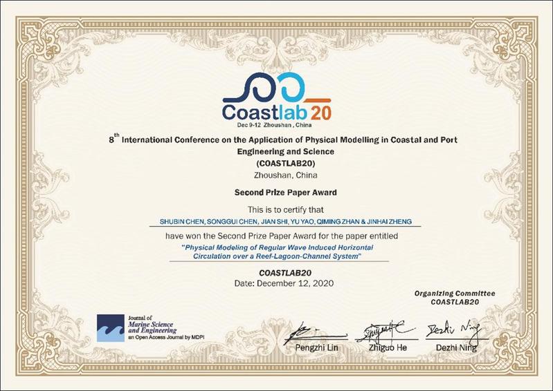 龚政院长、张弛教授、薛米安教授、周曾教授、管大为教授、时健副教授、连宇顺副研究员、隋倜倜副研究员、沈骁腾副研究员、程林博士、张炫博士以及多位研究生共19人参加了本次会议并作了11场学术报告,其中龚政院长和张弛教授分别作了题目为“A new in-situ annular flume for measurements of the erosion threshold on intertidal flats”和“Beach safety accidents in Chinese mainland coasts”的特邀报告。在会议闭幕式上,郑金海教授指导的硕士研究生陈树彬同学获得由三位大会主席联合签发的“Second Prize Paper Award”。