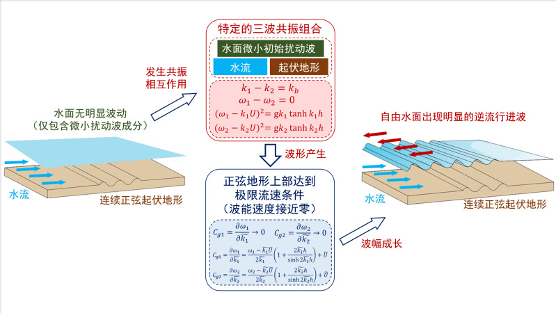 连续沙波广泛存在于河口海岸地区,它与水流、波浪的相互作用机制十分复杂。虽然现场和实验室都有观测到水流经过连续沙波地形会产生逆流行进波的现象,但是其激发条件和成长机制一直没有得到理论上的解释。