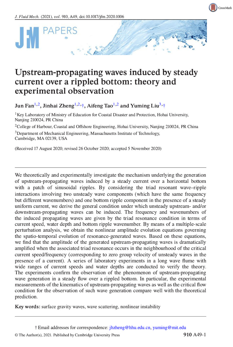 团队博士研究生范骏、指导教师郑金海教授、陶爱峰教授和“河海学者”讲座教授Liu Yuming博士合作完成的研究论文“Upstream-propagating waves induced by steady current over a rippled bottom: theory and experimental observation”发表在流体力学领域享有盛誉的国际顶尖期刊《Journal of Fluid Mechanics》上(//dx.doi.org/10.1017/jfm.2020.1006)。研究工作得到国家杰出青年科学基金(51425901)的资助。
