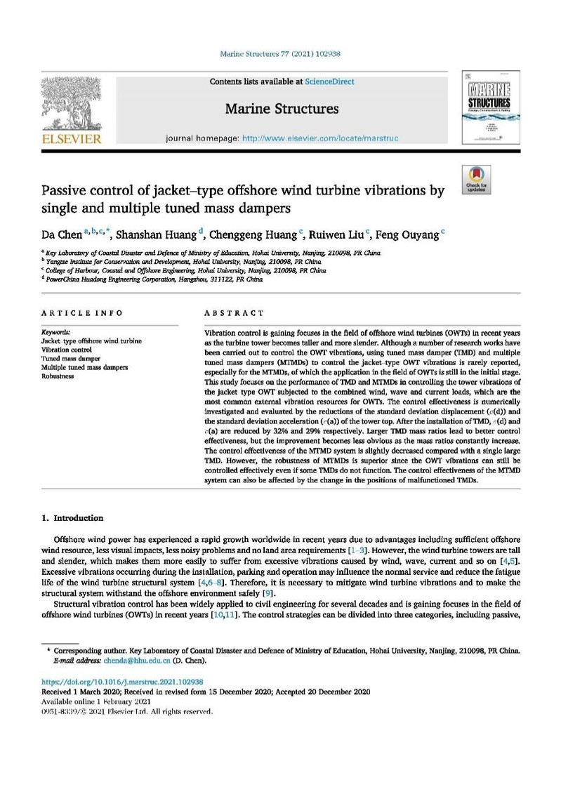 近日,欧洲足球赛程 陈达教授领衔的近海工程结构团队在海洋工程领域权威期刊《Marine Structures》(一区Top,影响因子2.708)上发表题为“Passive control of jacket-type offshore wind turbine vibrations by single and multiple tuned mass dampers”的学术论文。