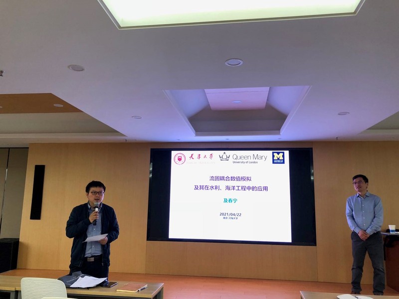 及春宁教授作了题为“流固耦合数值模拟及其在水利、海洋工程中的应用”的学术报告,报告详细介绍了及春宁教授课题组十几年来的代表性科研成果,包括流固耦合数值模拟中的迭代式浸入边界算法,高性能并行计算程序的开发及其在泥沙颗粒运动、仿生水草缓流促淤、柔性立管涡激振动和斑海豹胡须尾迹追踪中的模拟研究等。会后,及春宁教授和与会师生就流固耦合最新数值算法及其应用前景展开了热烈的讨论与交流。