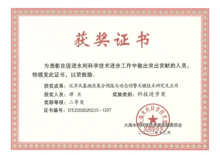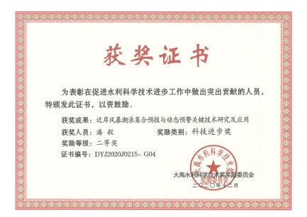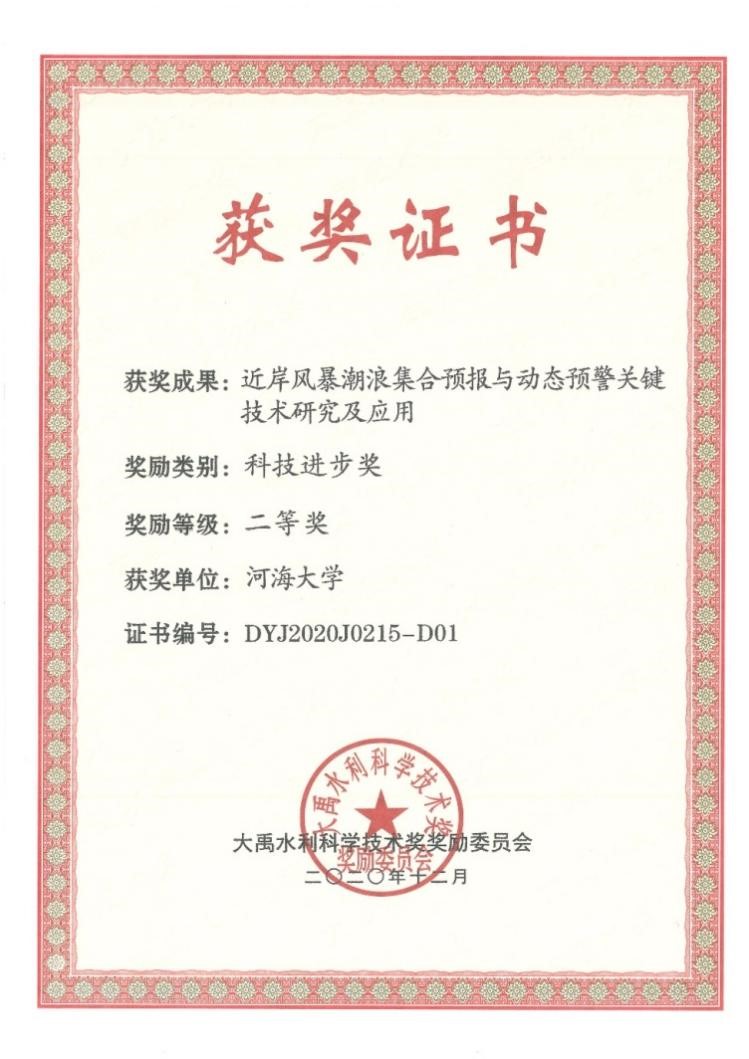 近日,大禹水利科学技术奖委员会颁发了2020年度大禹水利科学技术奖。由欧洲足球赛程 和水利部信息中心、南京水利科学研究院等七家单位合作完成的项目“近岸风暴潮浪集合预报与动态预警关键技术研究及应用”获得2020年度大禹水利科学技术奖二等奖。欧洲足球赛程 为第一完成单位,欧洲足球赛程 陈永平教授为第一完成人,潘毅青年教授为第四完成人,谭亚副教授为第七完成人。