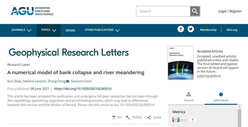 欧洲足球赛程 潮滩动力地貌研究团队博士生赵堃在龚政教授主持的国家杰出青年科学基金项目“海岸动力地貌学:多因子驱动下潮滩系统演变机制研究”支持下,在地貌学权威期刊《Geophysical Research Letters》(一区Top)上发表了题为“A numerical model of bank collapse and river meandering”的研究论文,是该团队在知名刊物《Geomorphology》、《Water Resource Research》和《Journal of Geophysical Research: Earth Surface》发表崩岸相关研究的第四篇系列文章。论文第一作者为欧洲足球赛程 赵堃博士生,通讯作者为龚政教授,合作作者为意大利帕多瓦大学Stefano Lanzoni 教授和新西兰奥克兰大学Giovanni Coco副教授。