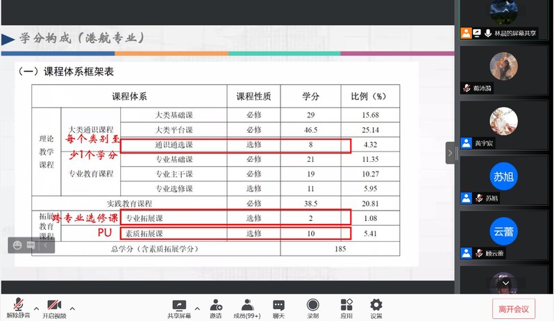 讲座伊始,林晨老师通过数据、图表等方式带领同学们归纳总结了港航院2020级在大一学年课堂学习、第二课堂、社区管理等方面的表现。此外,林晨老师具体讲解了港航专业、海资专业2020级培养方案,梳理解答了近期同学们集中反馈的关于各类选修课要求的疑问。