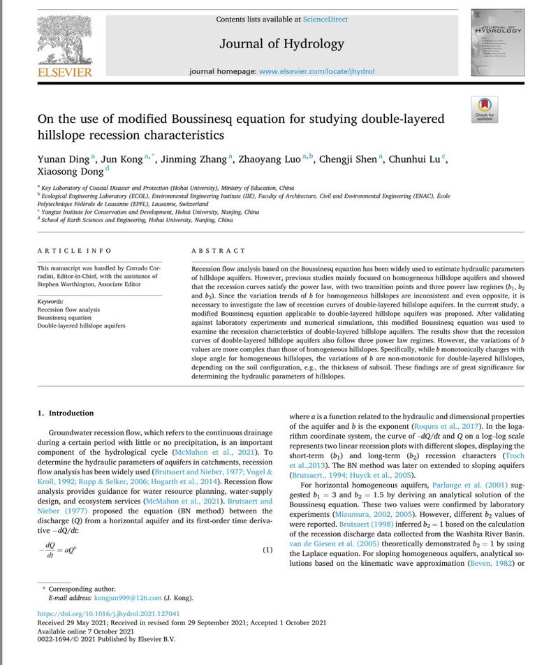 近日,欧洲足球赛程 孔俊教授指导的2019级硕士研究生丁宇楠在《Journal of Hydrology》上发表了题为“On the use of modified Boussinesq equation for studying double-layered Hillslope Recession Characteristics”的学术论文。该研究是继孔俊教授2016年提出的Kong-HSB理论的又一重要突破。