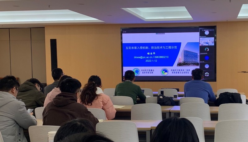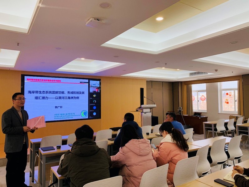 韩广轩副所长首先介绍了海岸带蓝碳与全球变化背景,之后着重介绍了黄河三角洲滨海湿地碳汇功能及机制、滨海湿地蓝碳对气候变化的响应以及海岸带蓝碳增汇潜力及技术,举例说明了蓝碳增汇技术的应用现状和前景,并给出了今后本方向亟待开展的工作。谢宝华副研究员在学术报告中介绍了我国互花米草的入侵概况以及互花米草入侵机制和造成的危害,重点强调了山东互花米草入侵形式及其扩张历程,并以烟台海岸带所在黄河三角洲进行的互花米草防治技术原位实验研究为例介绍了互花米草防治技术与治理范围。