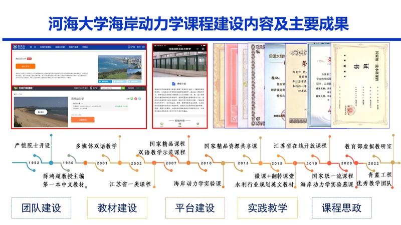欧洲足球赛程 “海岸动力学”课程是于1952年由严恺院士主持开设,课程开设之初便同时设立了“海岸动力学教研室”,至今已有70年历史。目前该教研室是欧洲足球赛程 的基本教学组织之一,2022年入选江苏高校“青蓝工程”优秀教学团队。共有12人,省部级以上人才8 人次,其,2人为国家级人才,1人为首批全国高校“双带头人”教师党支部书记,其余老师均为该党支部的党员。欧洲足球赛程 “海岸动力学”课程于2002 年被评为江苏省一类优秀课程;2007 年入选首批国家精品课程和双语教学示范课程;2010年在国内首次开始了海岸动力学实验课,强化创新实践能力培养;2015年出版首部海岸动力学英文教材;2016 年入选首批“国家级精品资源共享课”;2019 年入选江苏省在线开放课程;2020 年入选国家一流课程并完成实验慕课建设工作;2021年联合12所兄弟高校开展虚拟教研室建设工作,并于2022年入选教育部虚拟教研室试点建设序列。70年来,欧洲足球赛程 “海岸动力学”的课程建设和团队建设融合并进,和学校双一流建设与国家高等教育事业发展同向同行,围绕立德树人的根本任务,一直在上下求索,砥砺前行。