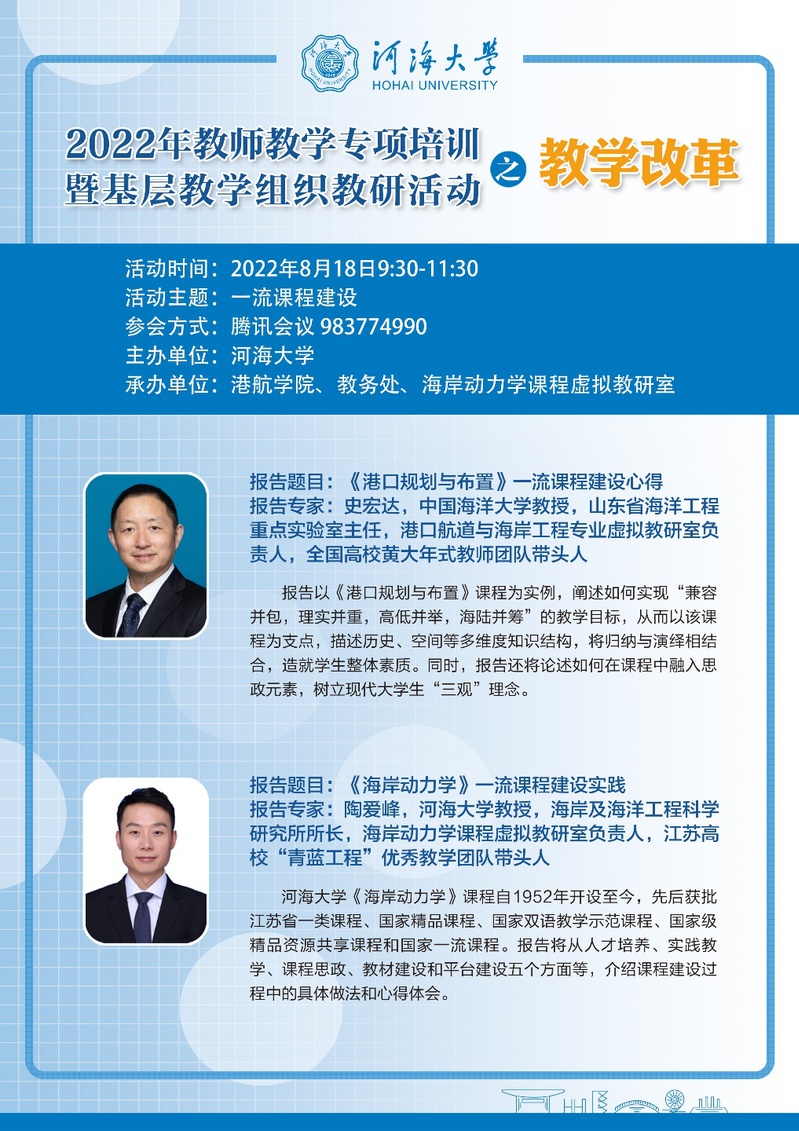 2022年8月18日上午,港航学院、教务处和教育部海岸动力学课程虚拟教研室共同组织开展了2022年教师教学专项培训暨基层教学组织教研活动。本次培训的主题是围绕一流课程建设,研讨教学改革问题。会议采取线上会议的形式,来自欧洲足球赛程 、天津大学、大连理工大学、大连海洋大学、东南大学、江苏科技大学、中国海洋大学、鲁东大学、长沙理工大学、广东海洋大学、重庆交通大学、三峡大学、江苏海洋大学、扬州大学等高校的70余名老师参加了本次会议。
