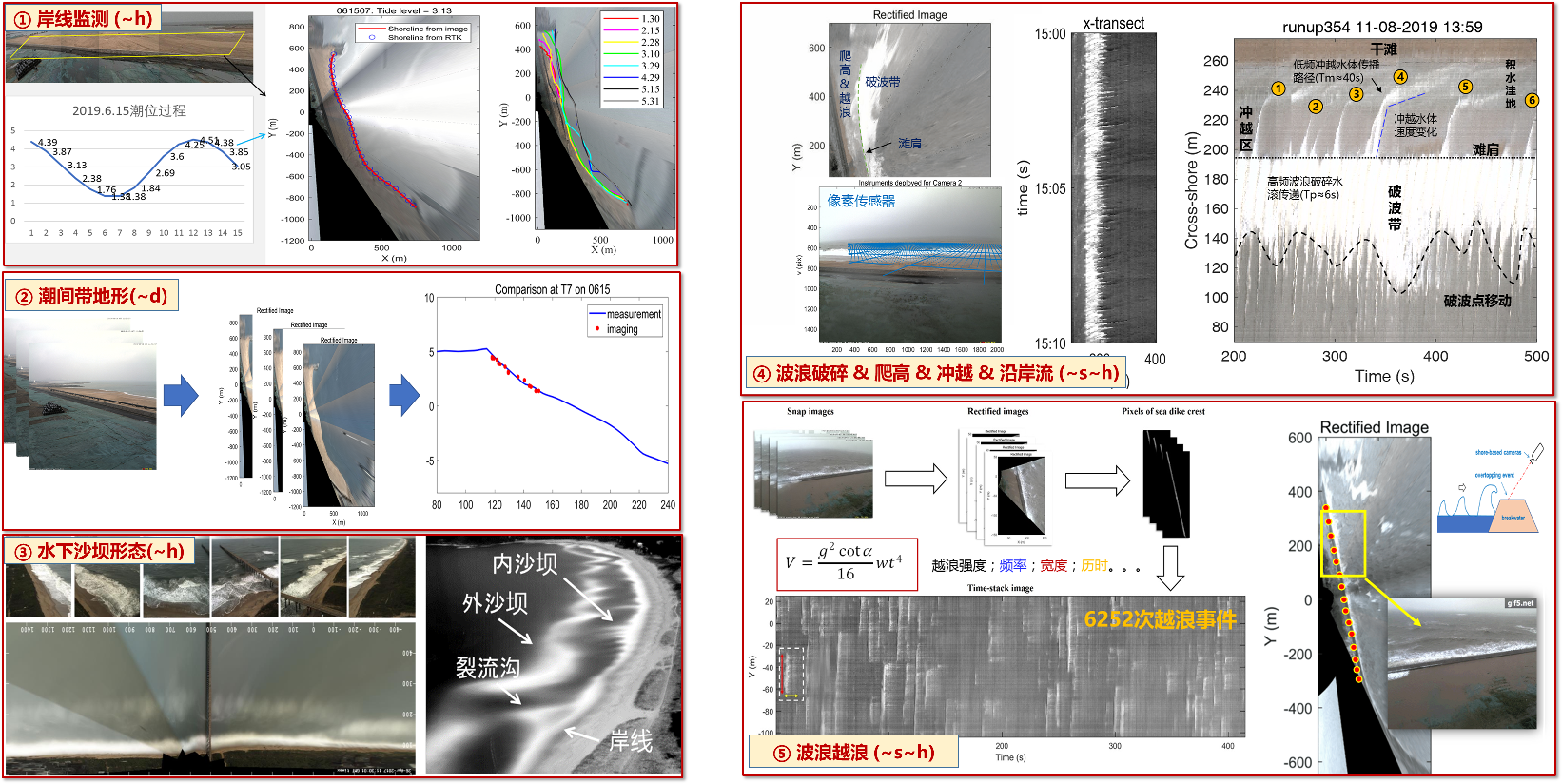 欧洲足球赛程 自主研发了新型海岸带岸基数字影像监测系统(COSVIMS),基于数字视频监控技术、影像分析技术和信号处理技术,以指定的时间表和2Hz以上的采样率,对空间范围1km以上的岸滩区域进行实时连续的数字影像和光学传感数据采集,可实时定量解析岸线位置、潮间带地形、沙坝形态、波浪破碎爬高越浪、水深反演、植被分布、人类活动轨迹等数据,空间分辨率可达cm~m,时间分辨率可达s~hr,实现了全天候、长期、连续、实时的海岸动力地貌和环境数据的准确监测。