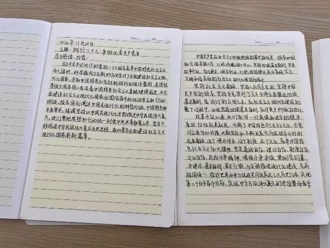 港航院研究生学硕三支部围绕“践行党的二十大、争做优秀共产党员”主题,以给每位党员建立“学习档案”的形式开展主题党日活动,在每一次学习活动中,党员在自己的学习记录本上进行记录与总结,并定期分享展示优秀学习笔记。在学习中结合党的二十大精神切实反思自身实际起到党员先锋模范作用的工作经历与弘扬水利精神下的科研担当,坚持和发扬理论联系实际的优良学风。