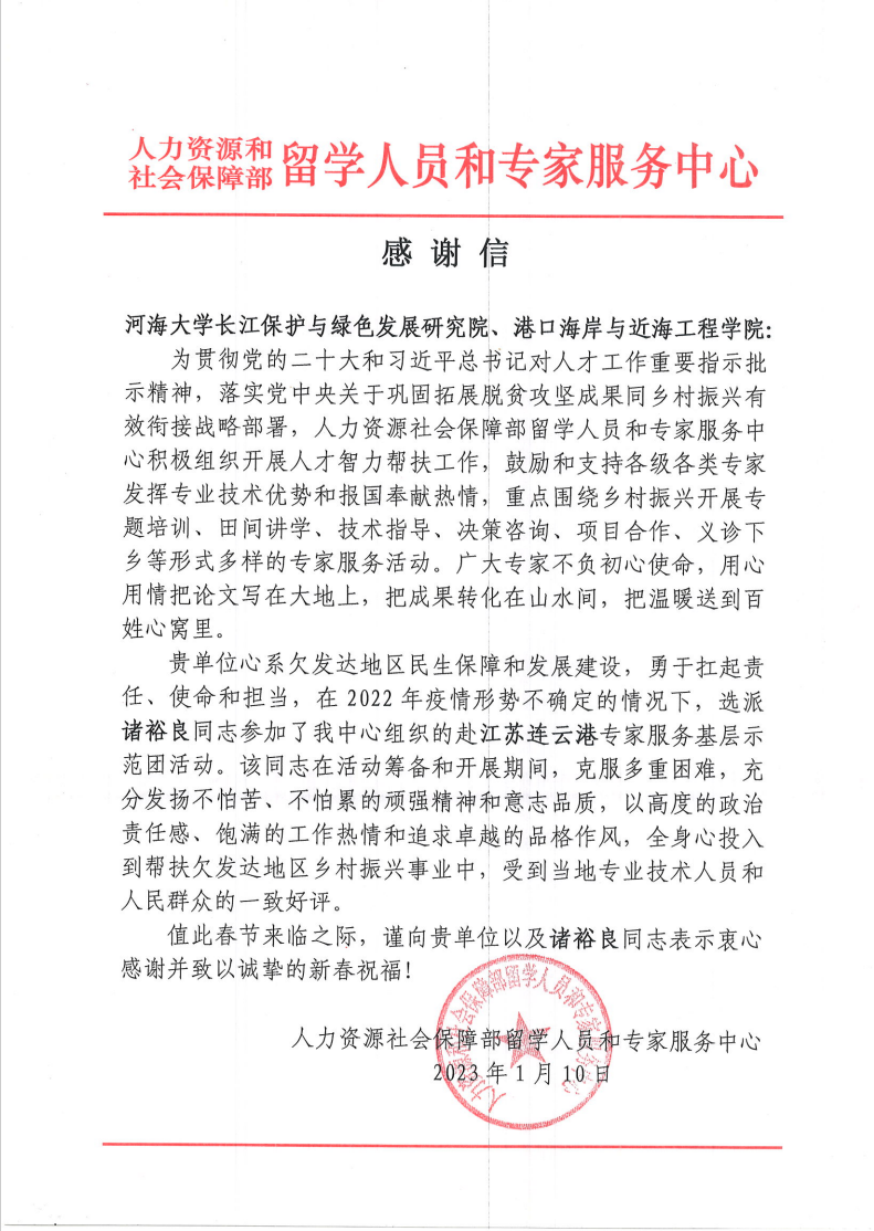 2022年10月,应人力资源和社会保障部留学人员和专家服务中心的邀请,欧洲足球赛程 选派诸裕良教授参加了该中心组织的赴连云港专家服务基层示范团。近日,欧洲足球赛程 收到了该中心发来的感谢信,感谢学院心系欠发达地区民生保障和发展建设,勇于扛起责任、使命和担当,高度赞扬诸裕良教授在赴连云港服务期间,克服困难,发扬不怕苦、不怕累的顽强精神和意志品质,全身心的投入到帮扶欠发达地区乡村振兴事业中,受到了当地专业技术人员和群众的一致好评。