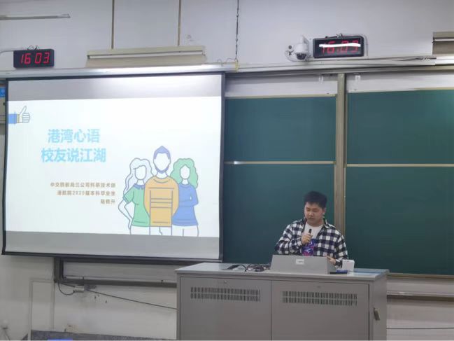 3月20日,港航院举行第2期“港湾心语 校友说江湖”,活动邀请陆鹤升校友来学院与学生分享了个人成长经历、工作经验,就如何做好本科生职业生涯规划为同学们答疑解惑。2020级全体本科生参加分享会,辅导员林晨主持。