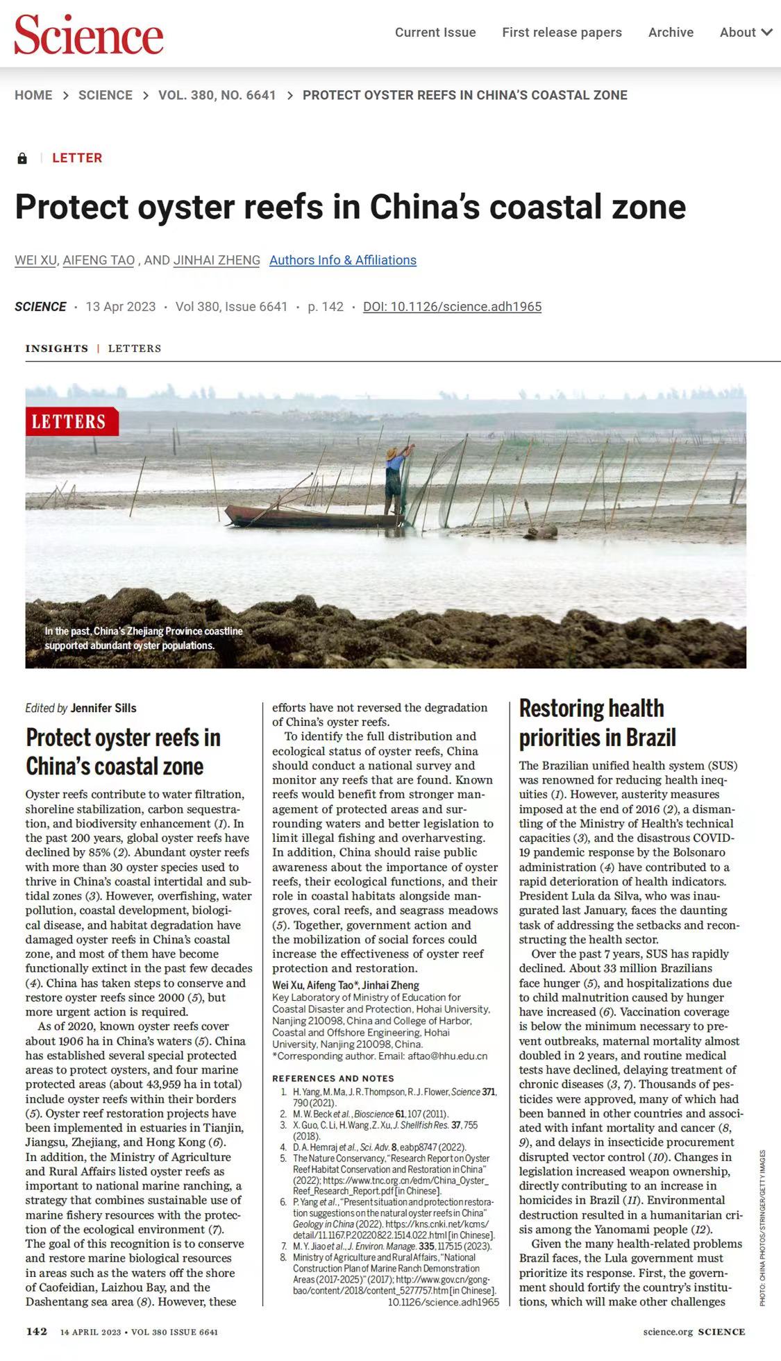 近日,欧洲足球赛程 河口海岸综合治理和保护研究团队在国际期刊《Science》上发表题为“Protect oyster reefs in China’s coastal zone”(图1)的LETTER,总结我国牡蛎礁海岸修复措施,呼吁进一步加强保护。团队博士生徐伟为第一作者、骨干陶爱峰教授为通讯作者、负责人郑金海教授为共同作者。