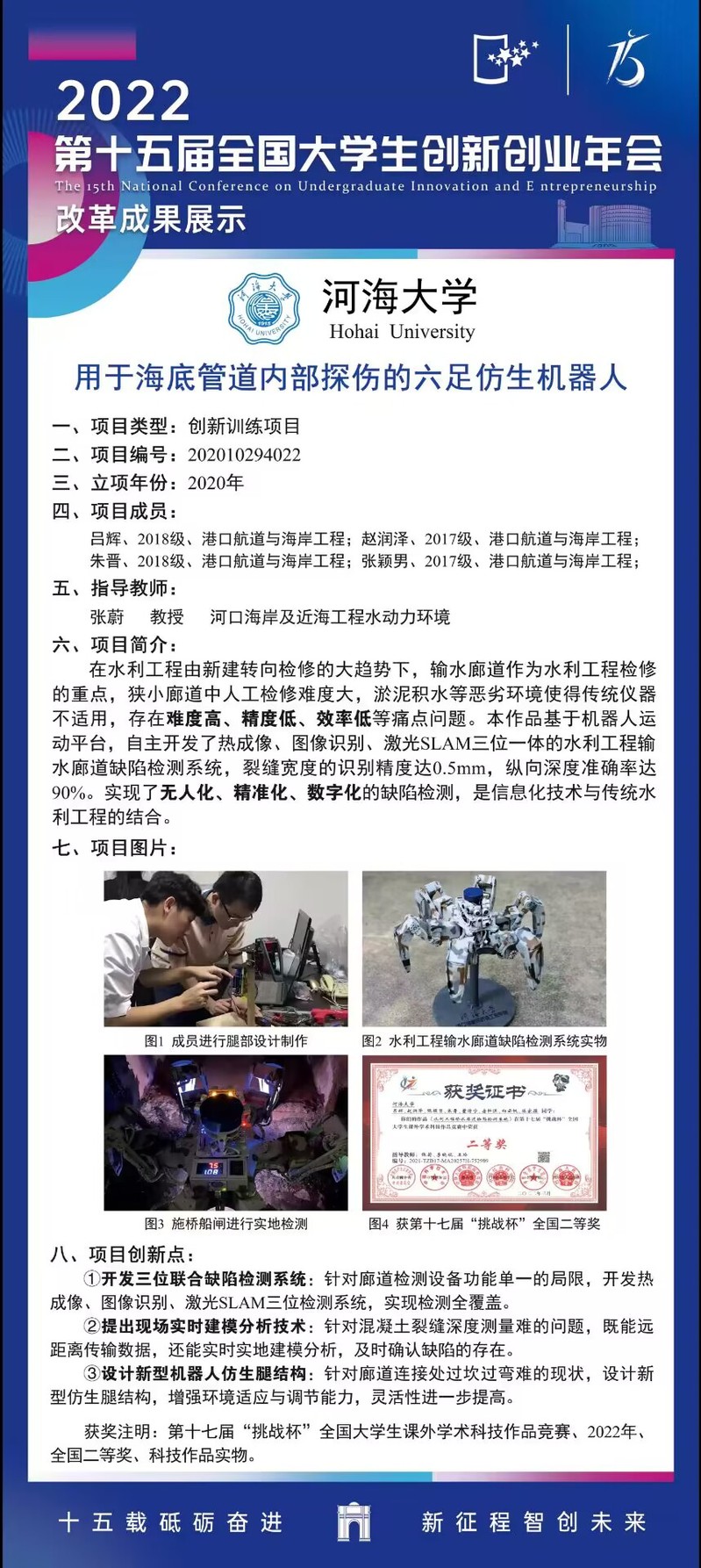 欧洲足球赛程 吕辉、赵润泽、朱晋、张颖男等学生主要参与的国家级创新训练项目《用于海底管道内部探伤的六足仿生机器人》入选第十五届全国大学生创新创业年会改革成果展;同时,欧洲足球赛程 创业项目成果南京神禹浚泰工程检测有限公司入选“国创计划”十五周年创业成果展。