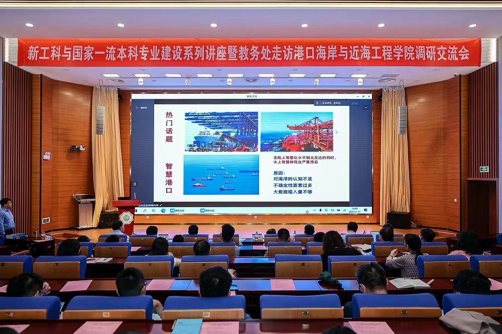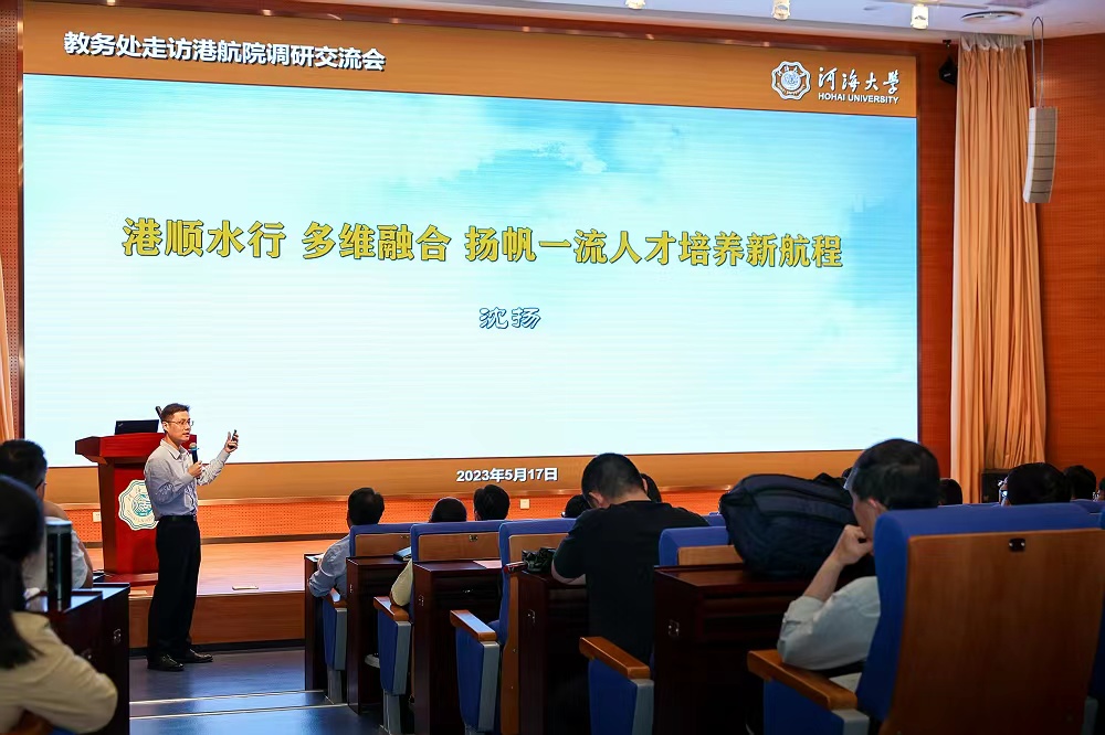 教务处交流报告环节,沈扬处长作《港顺水行 多维融合 扬帆一流人才培养新航程》专题报告。他首先对学院全体教师为本科教学的辛勤付出及卓越成效表示衷心感谢。接下来,他强调了在OBE理念下推进本科人才高质量培养过程中,校院协同构建人才培养质保体系的必要性,并表示港航学院作为学校水利学科的三个主体支撑学院之一,在本科人才培养中取得了突出成绩,而在面对新时代社会高质量发展的新要求下,希望学院能进一步结合自身专业特色,完善顶层设计,科产教汇聚,推动专业联合,在内强化实践,在外加强交流,做好课程系统化建设。他还通过核心数据的对比,客观分析了学院在专业发展、课程建设、教学与学科竞赛等方面取得的出色成绩,以及在专业协同、教学资源建设等方面可以继续开拓的方向。最后,他反馈了前期搜集的学院对学校教学、教务工作意见和建议的答复与完善办法,并表示教务处将继续全力支持学院在专业发展上的工作,希望学院奋力向前,再上新阶。